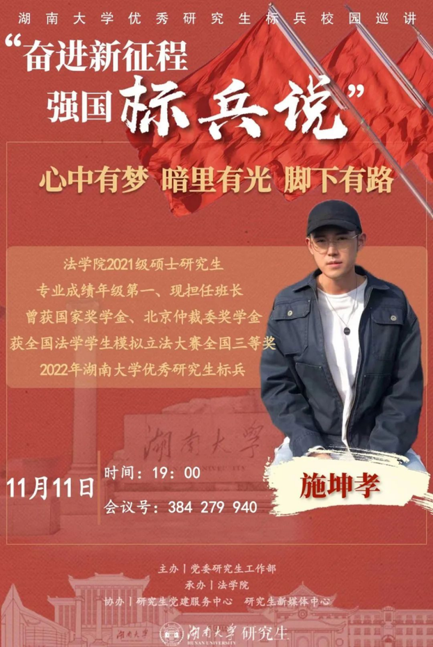 优秀研究生标兵、国家奖学金获得者施坤孝作为主讲人,以“心中有梦,暗里有光,脚下有路”为主题,向全体研究生分享学习、科研、就业、未来规划等方面的个人经验,为博彩平台