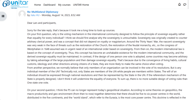 谈及此次培训经历,胡佳璐同学提到,这一个月以来最大的收获是打开了国际化视野、了解到更多看待世界局势的视角。培训系全英文授课,讲师的职业与国籍各异,但都具备某个领域的丰富知识与表达技能,讲授十分精彩。在与不同年龄、不同国籍、不同人生阶段的青年同僚交流的过程中,她也能感受到文化环境与社会形态对人们观念的巨大影响。