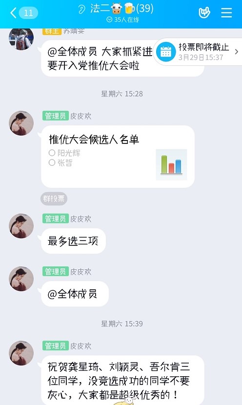 在参加推优的五位同学发表演讲的期间,参加线上会议的其他同学,及时回复反馈。五位同学的演讲发表完毕,接着会议进行到匿名投票环节。会议采取线上匿名投票,保证公正透明,1802班同学们积极参加投票。根据最终票数结果,确定入党积极分子,并由团支书葛欢在线上会议群中宣示成为入党积极分子的三位同学,他们分别是刘颖灵、龚星琦、吾尔肯。至此,此次入党推优大会正式结束。