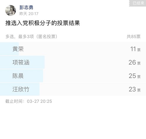 竞选同学发言完毕后,在团支书彭志勇和组织部赵玲羽同学的组织和监督下,同学们利用社交平台进行线上匿名投票。根据最终票数统计结果,陈晨、项筱涵、汪欣竹三名同学被顺利推选为入党积极分子。
