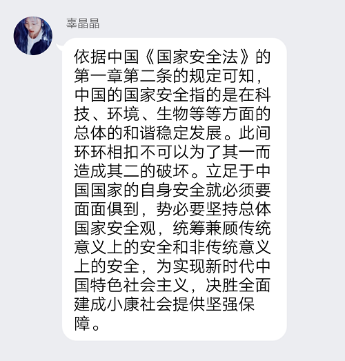 辜晶晶在分享观点时说“立足于中国国家的自身安全就必须要面面俱到,势必要坚持总体国家安全观。”。她从《中华人民共和国国家安全法》的法条出发,提出“国家安全是在科技、环境、生物等方面的和谐稳定发展,只有统筹各方要素,稳定总体国家安全观中的各个方面,才能使其为全面建成小康社会护航”的观点。