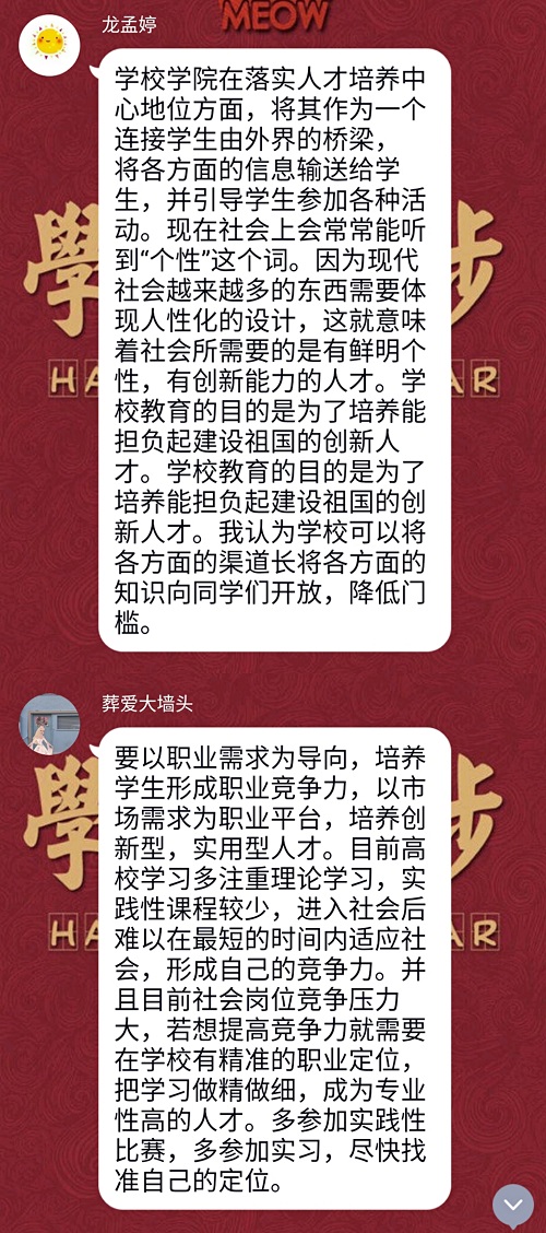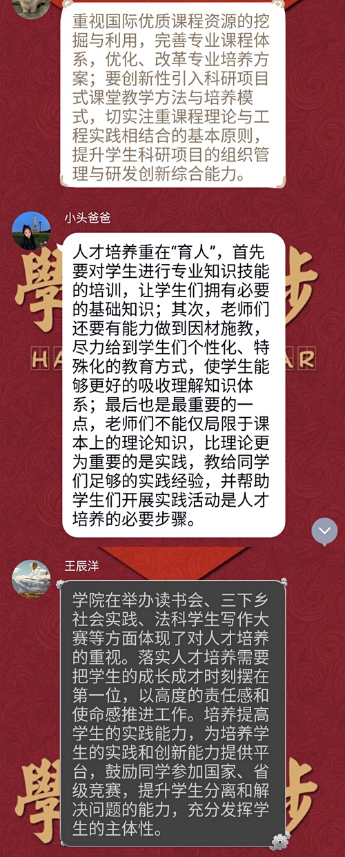 在此次讨论活动中,同学们对学校、学院的人才培养工作进行了回顾、给予了评价,也对下一步的“落实人才培养中心地位”工作提出了建议,并讨论了学生党员及辅导员实际行动层面的问题。希望同学们的意见与建议能够帮助学院、学校将人才培养计划落实得更为广泛、更为彻底!