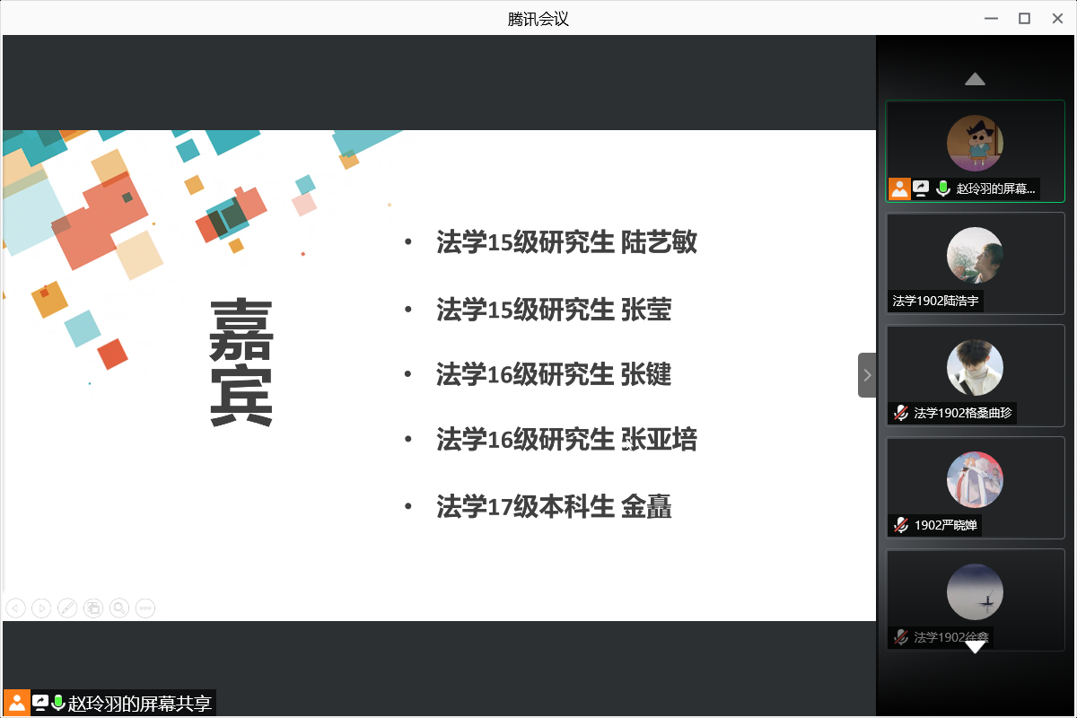 辞去小年,春节将至。2021年2月6日晚,为提高法学1902班同学的学习能力,解决同学们在学业上的困惑,张晓勇老师协调五位优秀的保研学子向大家分享宝贵的学习经验。张莹、张键、张亚培和金矗同学参与线上会议。陆艺敏学姐虽因事未能到场,但悉心地将经验整理成文档,分享给同学们。