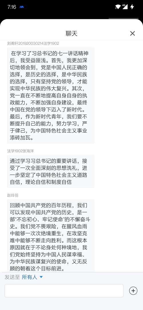 学习结束后,同学们纷纷踊跃发言,分享自己的学习心得。刘阁轩同学率先发言,她提到中国共产党既是历史的选择,也是人民的选择。广大青年应当紧跟党的脚步,不断努力,为社会主义建设事业添砖加瓦。张海洋同学表示,此次讲话学习后,自己对中国特色社会主义更加自信坚定。赵玲羽同学立足讲话精神,结合百年党史,提出青年学子要在学习和生活中攻坚克难,勇敢奋进。