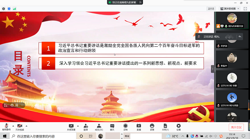 之后,宣传委员崔程新围绕着习近平总书记在“七一”讲话中所传递的重要精神,带领同学们展开了专题学习。分别从“习近平总书记重要讲话是激励全党全国各族人民向第二个百年奋斗目标进军的政治宣言和行动纲领”和“深入学习领会习近平总书记重要讲话提出的一系列新思想、新观点、新要求”两部分,与同学们一起学习了习近平总书记的重要讲话精神。