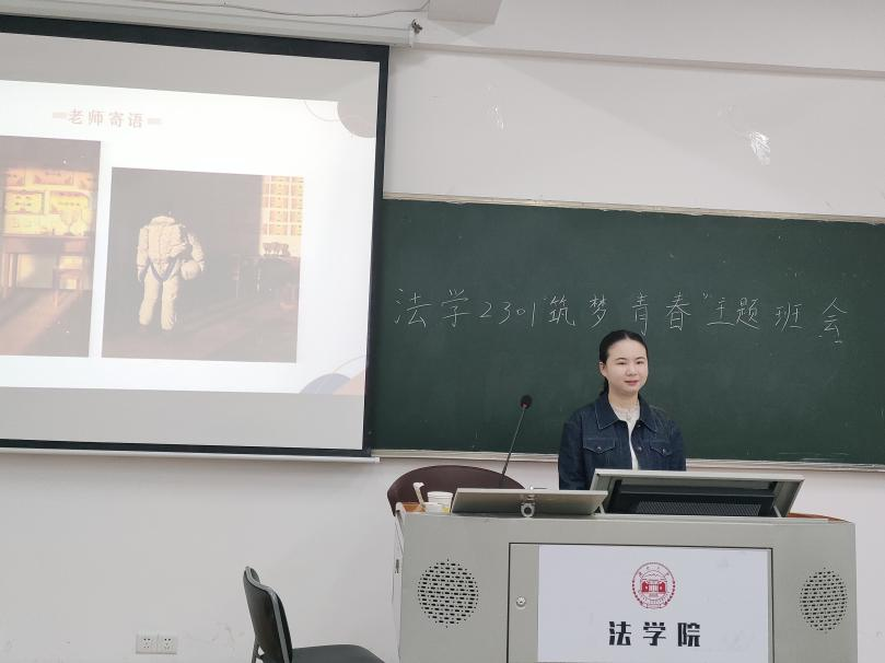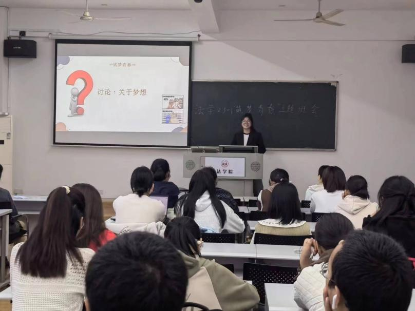 法学2301班班长杨家君同学以四个问题开篇:“你还记得小时候的梦想吗”“为了这个梦想,你付出过哪些行动”“你现在的梦想是什么”“作为新时代中国青年,我们的梦想应当是怎样的”,引导同学们思考自身理想与个人付出的关系,鼓励同学们付诸实践,让梦想不止于空想。班主任李婧嵘老师对法学2301班同学进行全体寄语,对法科学生的专业学习与生涯规划进行详细说明。她表示,个人价值的实现应当与国家的前途联系起来,而个人理想也与国家未来密切挂钩,鼓励同学们应当"与自己对话",立足当下的需求,追寻自己的本心,坚定理想并不断为之奋斗,努力成为一个内心富足的人。辅导员龙芷蔚老师总结,希望同学们深入思考如何有意义地度过大学四年,激励同学们不断提升综合能力素养,放飞梦想,追逐青春!