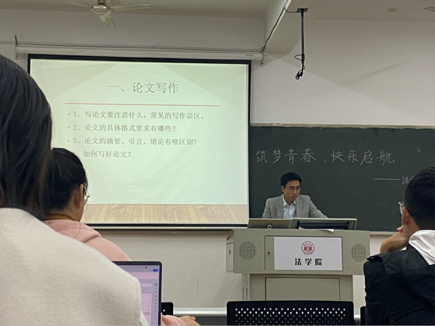 法学2304班有幸邀请到了班主任周子实老师为同学们详细地讲授法学论文写作的方法、期中期末考试的流程等内容,周老师还逐一解答了同学们关于日常学习和升学就业的问题。周老师强调,热爱是学习的动力,要学会发掘法学的趣味,多从生活中汲取经验和知识,这样才会带来源源不断的学习热情,从而学好法学这一学科。