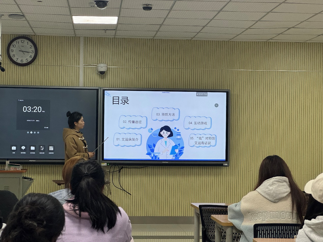 2404班班委于研究生楼B201教室开展了以“拒绝‘艾’,拥抱爱”为主题的班会,2404班全体同学皆到场参与。