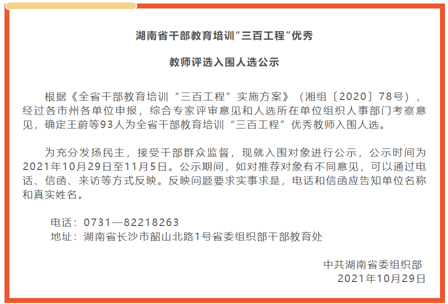 按照中央和省委关于新时代加强和改进干部教育培训工作的部署,决定在全省组织实施干部教育培训“三百”工程,即推选百名优秀教师、评选百门精品党课、遴选百个攻坚克难典型案例(简称“三百”工程)。通过实施“三百”工程,进一步加强全省干部教育培训师资力量、课程质量和资源建设,全面打造政治站位高、课程质量好、联系实际紧的理论和党性教育课程体系。根据《全省干部教育培训“三百工程”实施方案》(湘组〔2020〕78号),经过各市州各单位申报,综合专家评审意见和人选所在单位组织人事部门考察意见,最终在全省一共确定93人为全省干部教育培训“三百工程”优秀教师入围人选,主体为党校系统优秀教师,少部分为其他高校优秀专家。其中博彩平台 、湖南师大、湘潭大学等高校各有一名入选者。