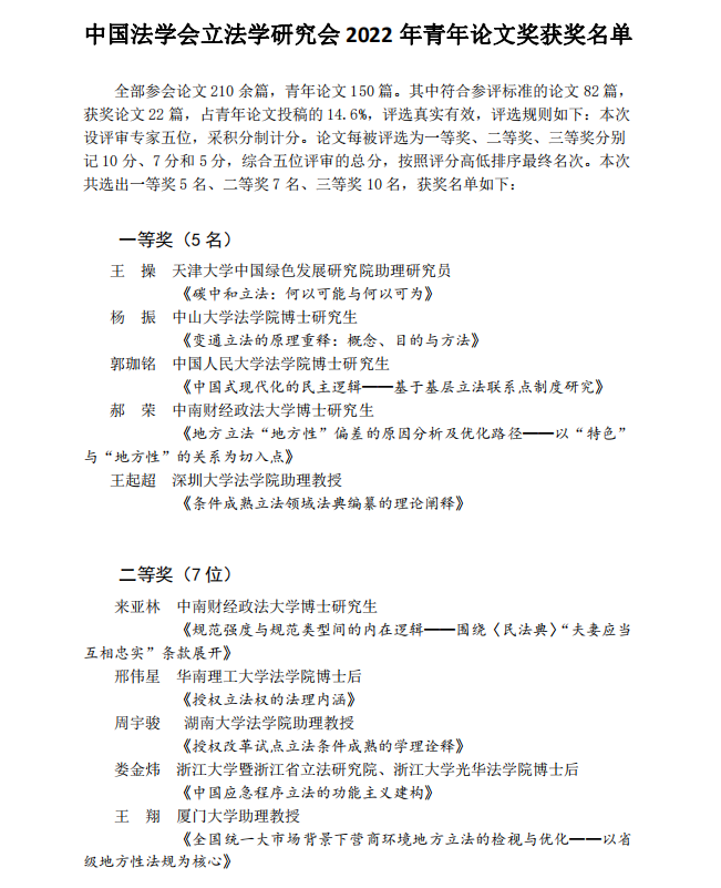 本次学术年会中,全部参会论文210余篇,青年论文150篇。其中符合参评标准的论文82篇,获奖论文22篇,占青年论文投稿的14.6%,评选真实有效,综合五位评审的总分,按照评分高低排序最终名次。本次共选出一等奖5名、二等奖7名、三等奖10名。