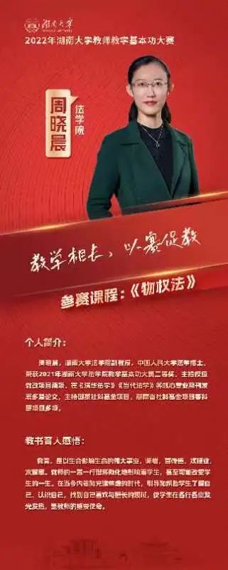 周晓晨老师通过学校督导随堂听课、教学设计等环节的层层选拔,从全校众多参赛选手中脱颖而出,获得参加文科组决赛的资格。决赛中,周晓晨老师以法学专业核心课程《物权法》参赛,选取建筑物区分所有权中的“住改商”问题进行讲解。周老师通过身边的生活事例引入主题,结合司法案例和法学基本原理,对《民法典》第279条进行了生动有趣的讲解。短短10分钟的现场授课,周老师亲切自如、深入浅出的讲课风格给现场评委和观众留下了深刻印象。最终,周晓晨老师荣获2022年博彩平台