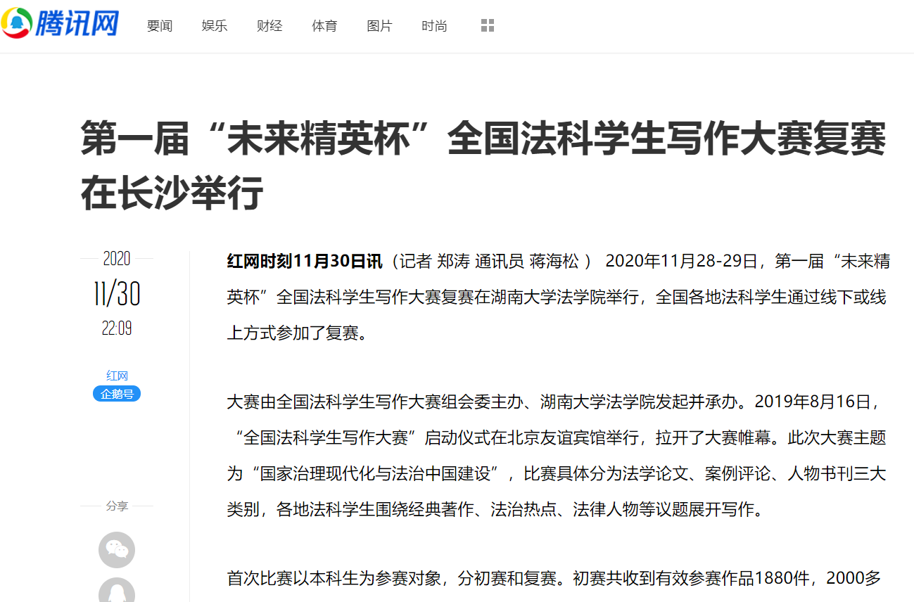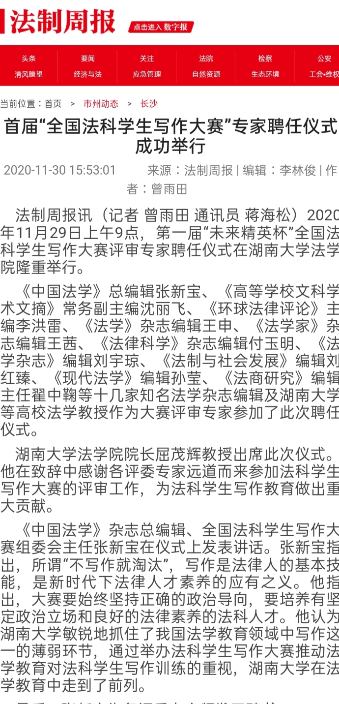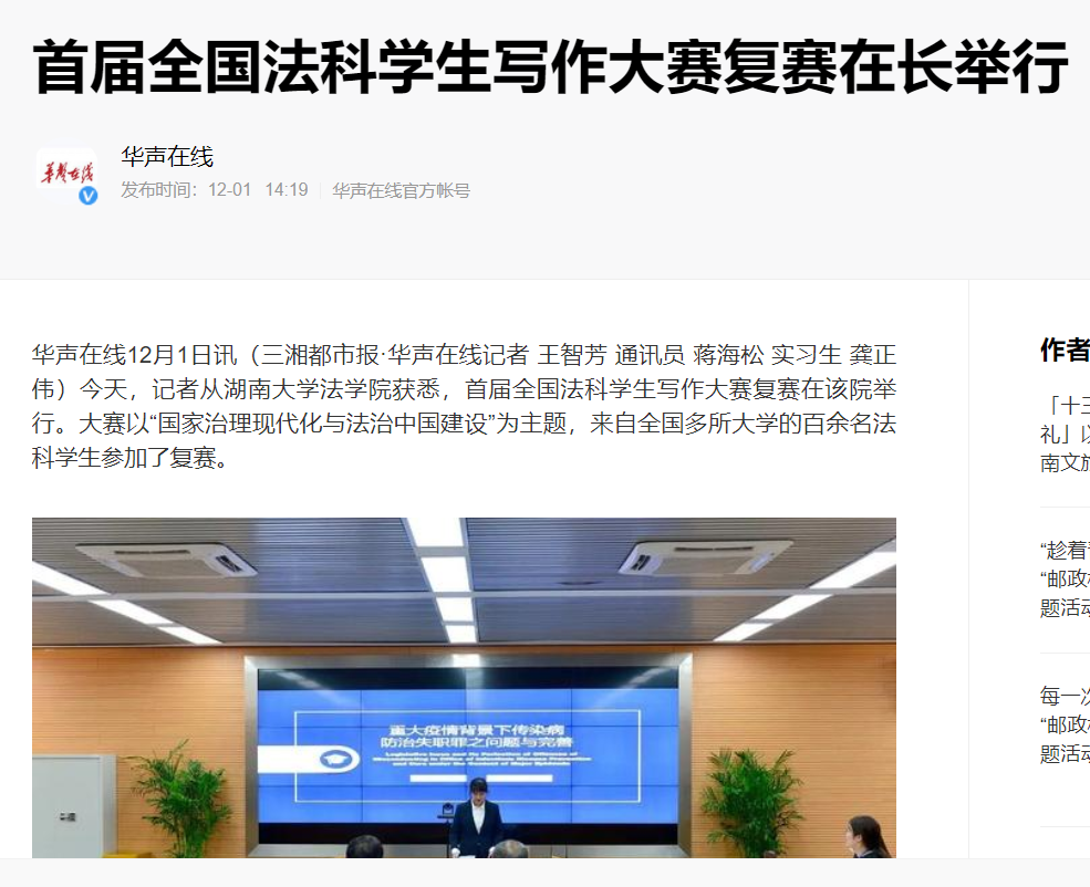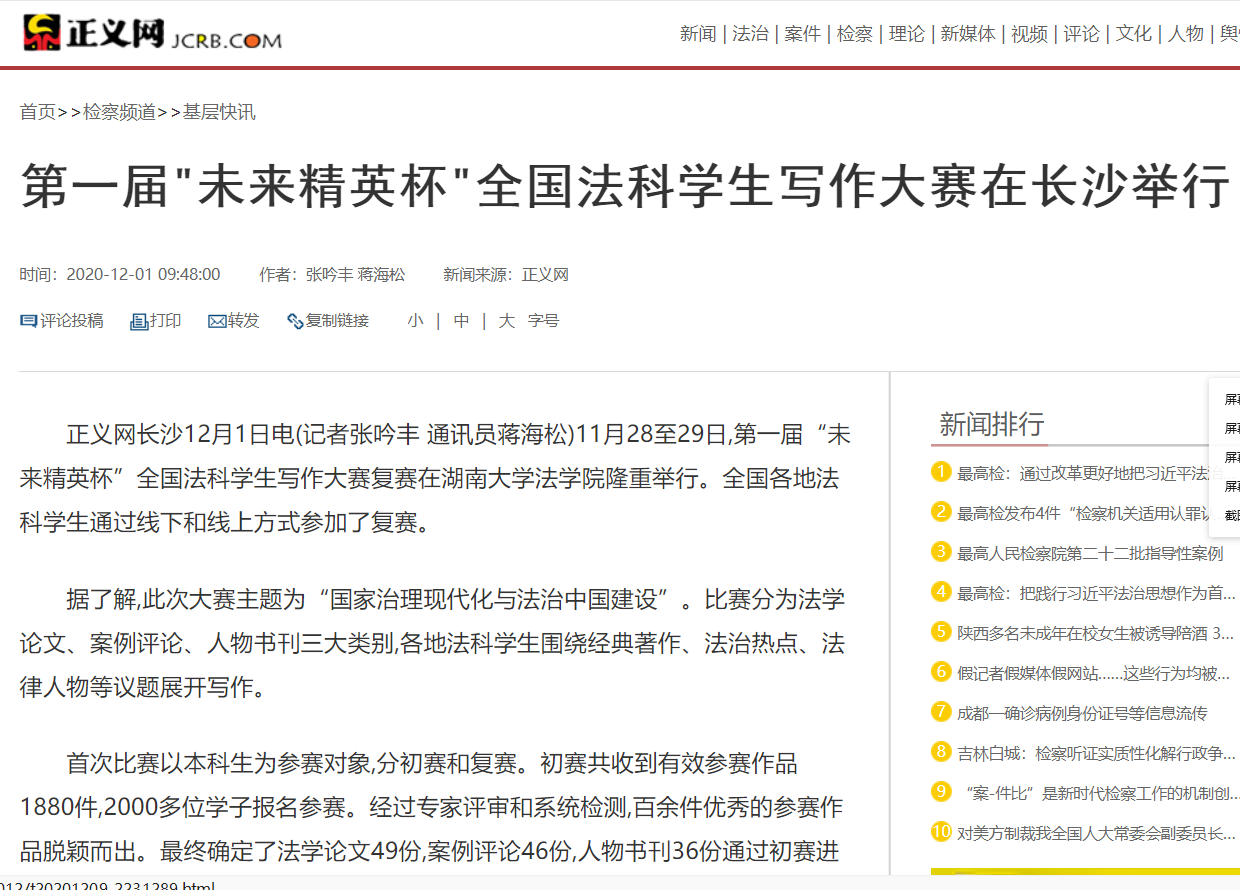 “全国法科学生写作大赛”复赛的成功启动引发全国媒体密集报道。据不完全统计,已有中国新闻网、《光明日报》、法制网、正义网、《法治周末》、《法制周报》、《长沙晚报》、《三湘都市报》、新湖南客户端、红网、腾讯网、华声在线、掌上长沙、博彩平台