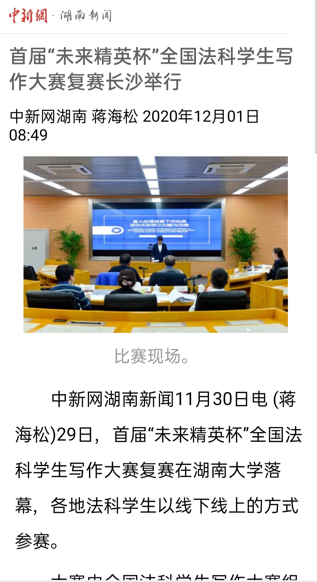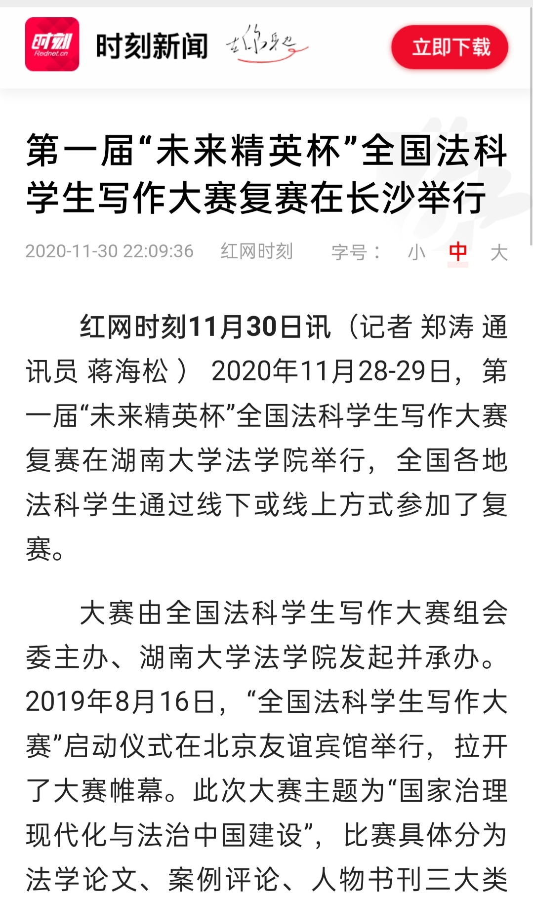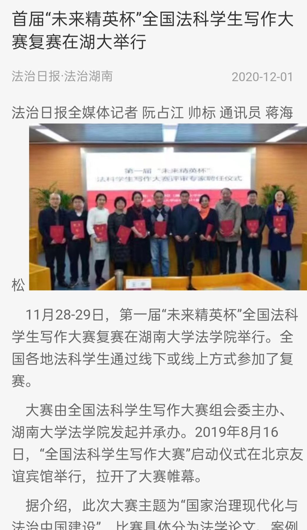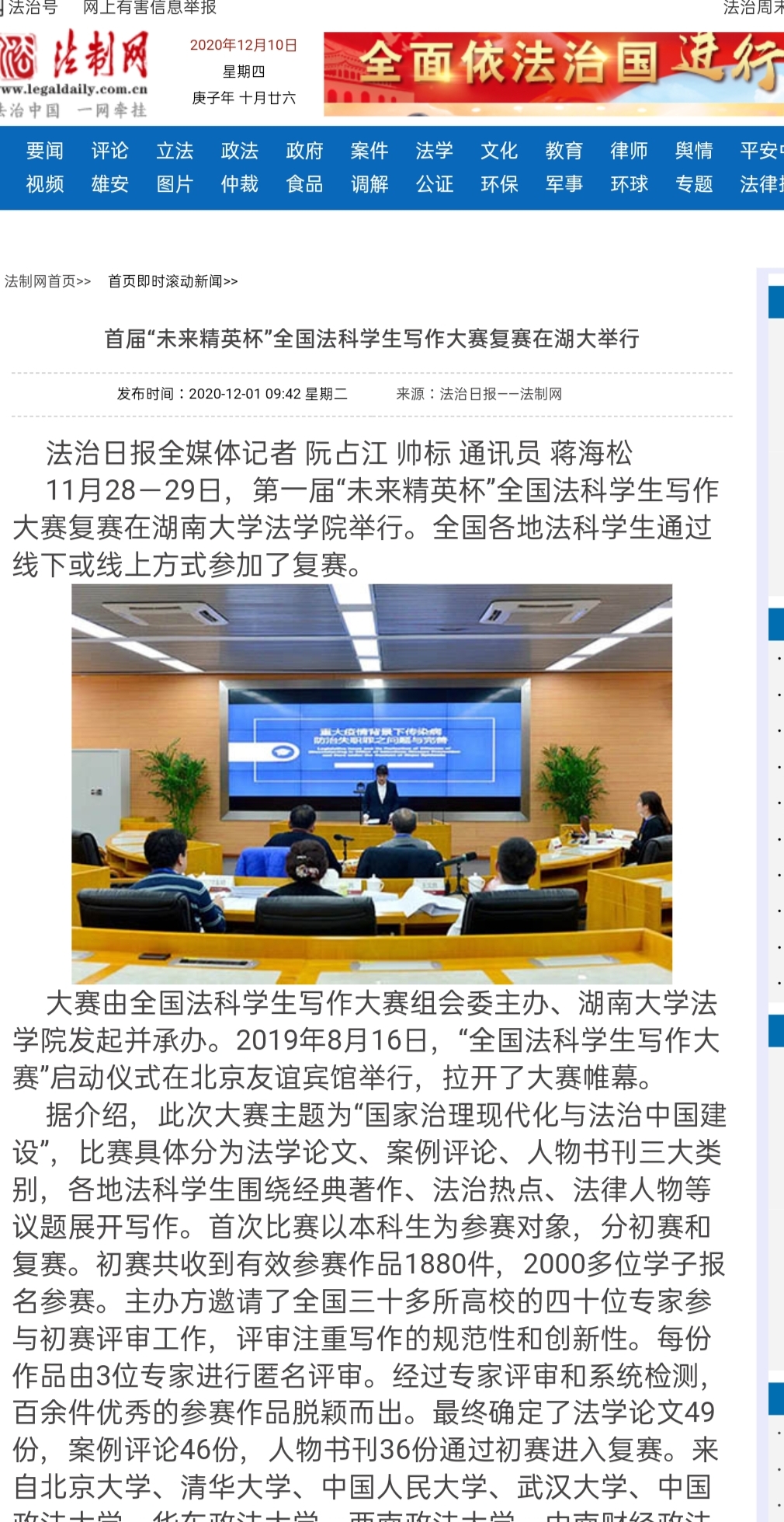 “全国法科学生写作大赛”复赛的成功启动引发全国媒体密集报道。据不完全统计,已有中国新闻网、《光明日报》、法制网、正义网、《法治周末》、《法制周报》、《长沙晚报》、《三湘都市报》、新湖南客户端、红网、腾讯网、华声在线、掌上长沙、博彩平台