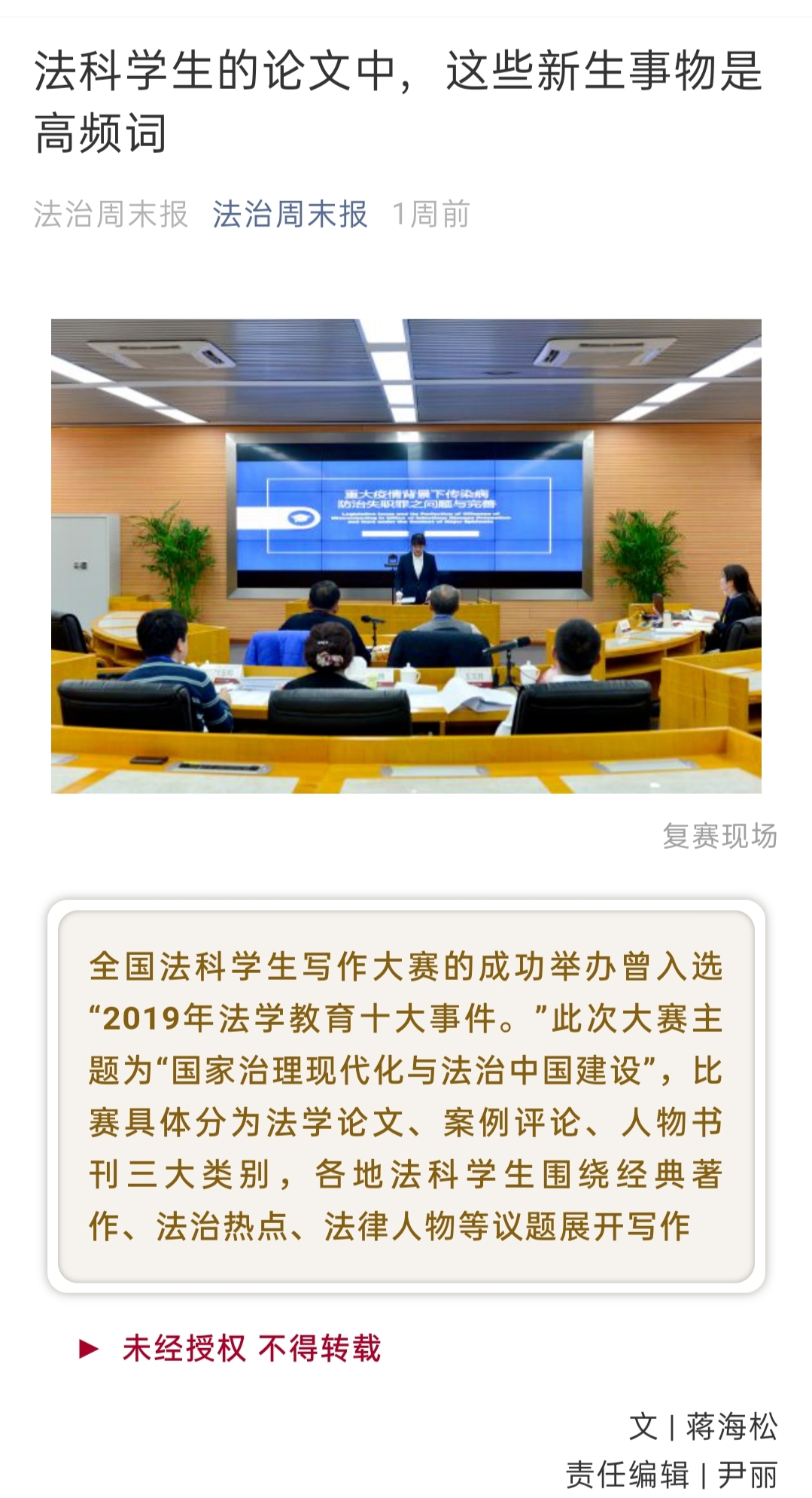 发起并承办。2019年8月16日,“全国法科学生写作大赛”启动仪式在北京友谊宾馆举行,拉开了大赛帷幕。拟每年主办一届。大赛的成功举办引发全国法学家、教育界的广泛关注,曾入选“2019年法学教育十大事件。”