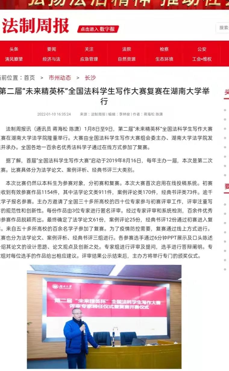 法制周报讯(通讯员 蒋海松 陈潇)1月8日至9日,第二届“未来精英杯”全国法科学生写作大赛复赛在博彩平台