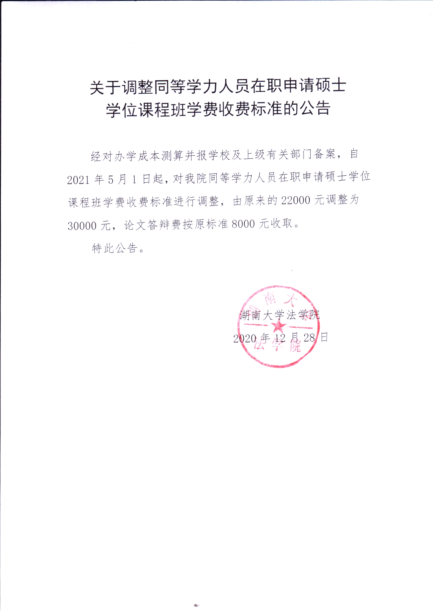 关于调整同等学力人员在职申请硕士学位课程班学费收费标准的公告