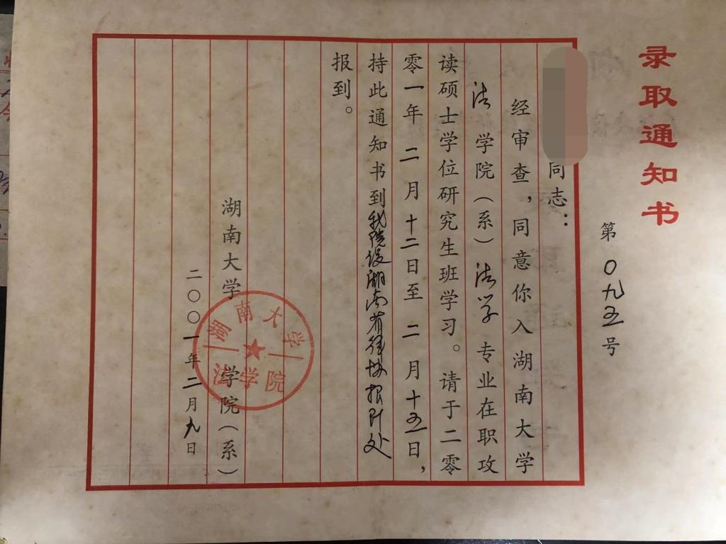 校友表示当年报考同等学力申硕班的时候已经参加工作,清晰的记得当时的班主任是罗智勇老师(原博彩平台 副教授,现最高人民法院审判监督庭副庭长),21年来一直珍藏着当年的录取通知书、学员证,有幸来到湖大学习是人生中最美好的时光。