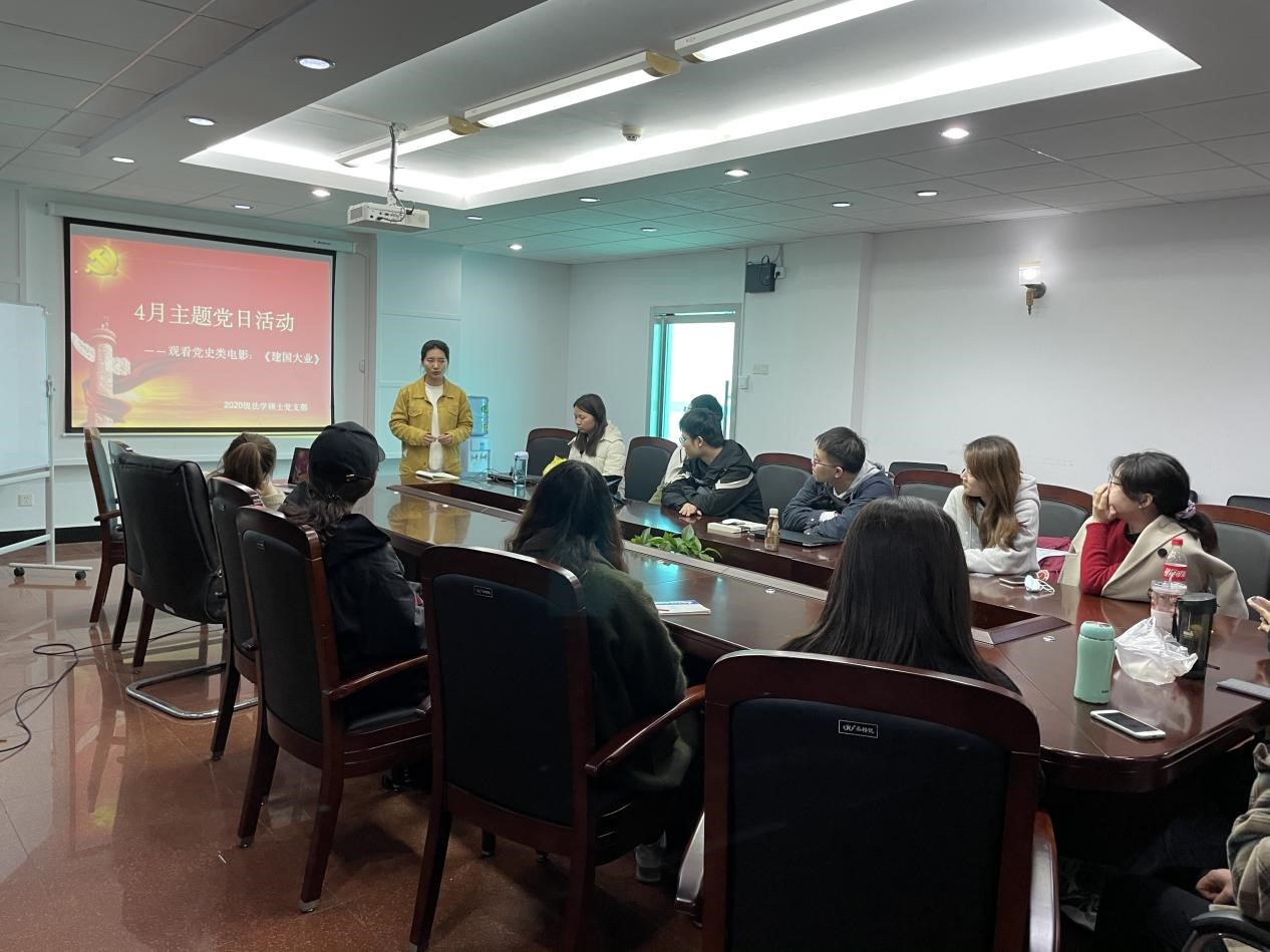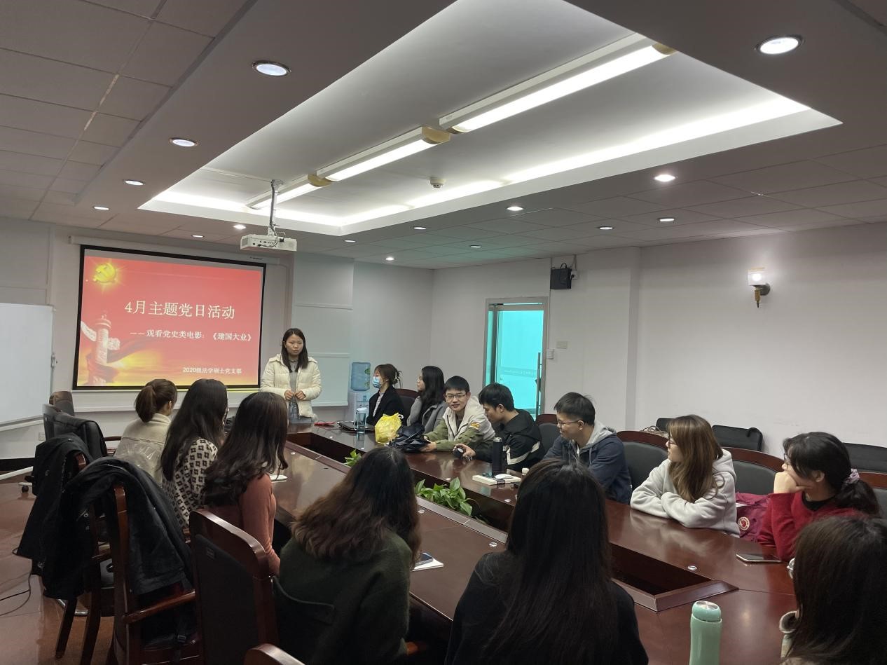 活动上首先由支部书记赵瑞同志向同志们传达4月主题党日活动精神,即“一切向前走,都不能忘记走过的路;走得再远、走到再光辉的未来,也不能忘记走过的过去,不能忘记为什么出发”。 接着,组织同志们观看了党史类电影:《建国大业》。在观看过程中,党员们深切地感受到共产党人为了国家、民族和人民的利益舍生忘死、义无反顾的执着信念。 观看电影完毕后,党员同志们纷纷表达了自己的切实体会。敬若男同志表示看完《建国大业》后,感触最深的就是我们如今安逸幸福的生活有多么来之不易。电影通过虚实相映的手法展现历史,省去大量篇幅但又完整还原历史。电影传递出来的中国共产党员在当时动荡年代抛头颅洒热血的家国情怀,需要我们一代又一代党员用行动来传递。程苏文同志认为,影片重心不在打打杀杀的大场景,意在告诉我们这个天下并不是完全靠冰冷的兵器打出来的,而是要取得人心。正是有了先辈们前赴后继的努力,我们才有了今天这样和平、幸福的生活。我们要向优秀的共产党员学习,在新时期铸造新辉煌。最后,由20级法学硕士党支部纪律委员桂颖琦同志总结了入学以来支部存在的的纪律问题,并强调支部党员同志们应重视自身的政治纪律、组织纪律和学习生活纪律这三方面的纪律问题。