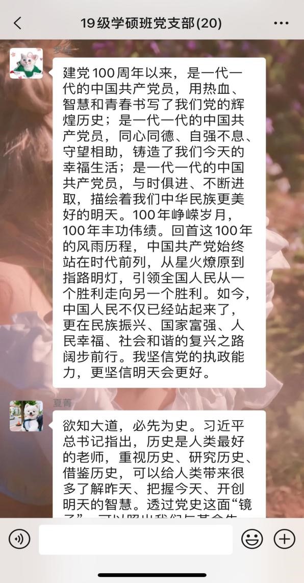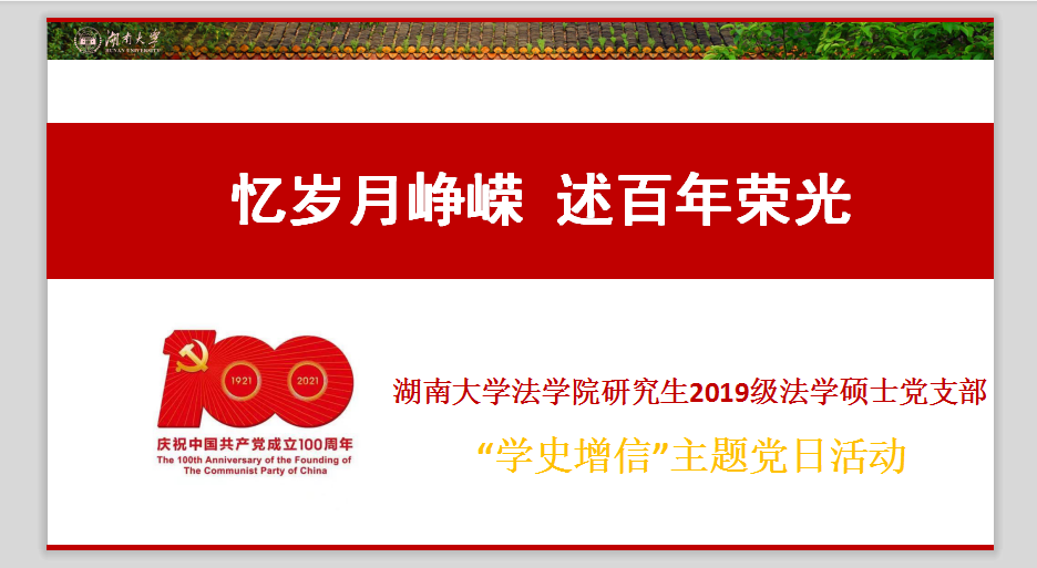 2019级法学硕士党支部于2021年5月18日晚8点召开了“忆峥嵘岁月·述百年荣光”专题党课学习活动。本次专题党课由支部陈家锐同志通过腾讯会议的方式进行线上宣讲,支部全体成员认真学习领会党课精神。