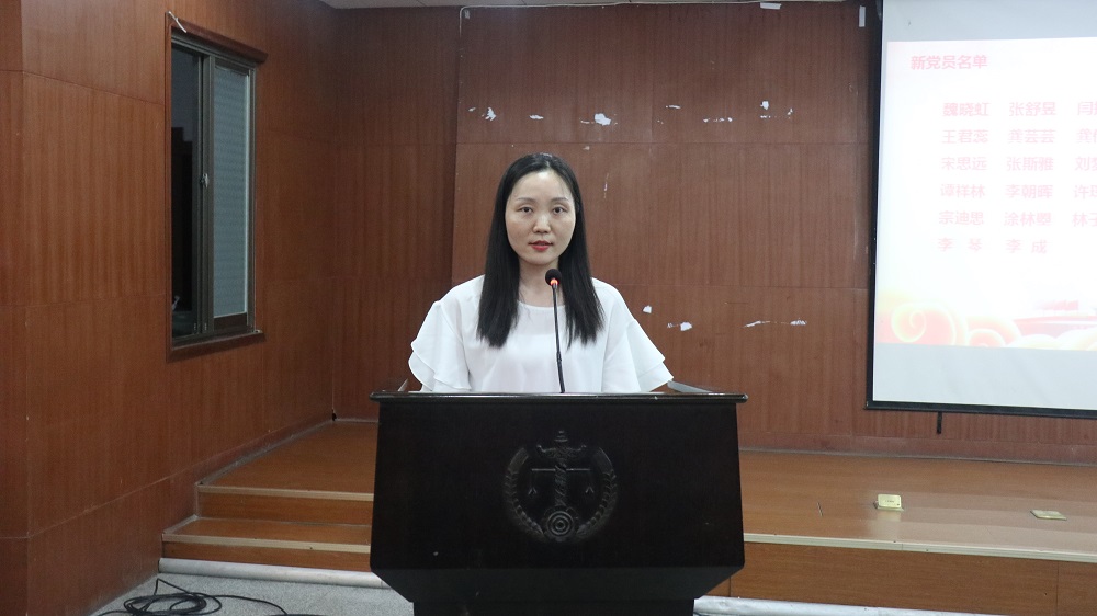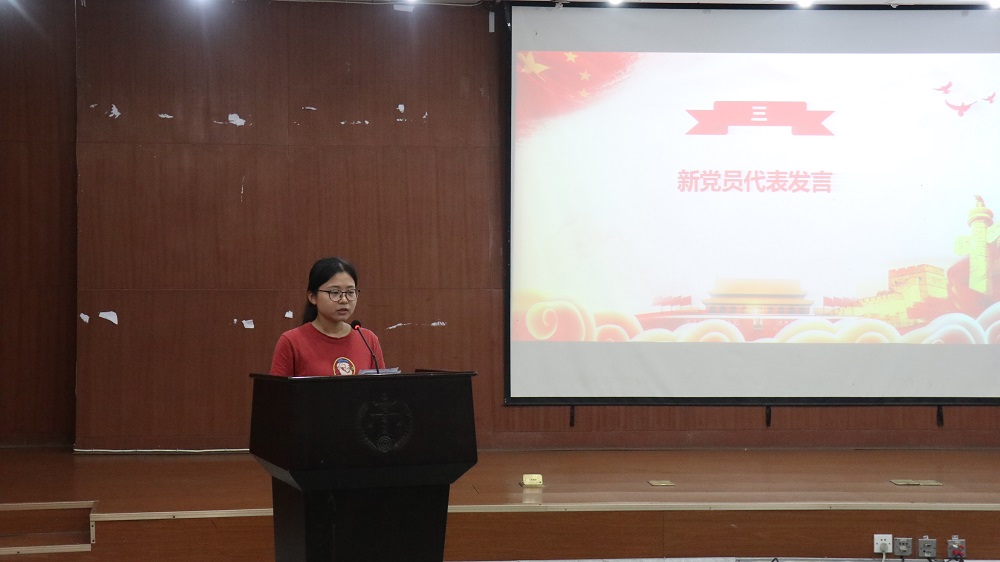 晚7时整,大会在雄壮的国歌声中正式开始。党务与人才工作办公室主任杨锦滔同志首先宣读博彩平台 新发展党员名单,全体新发展党员在学生党总支委员刘璇子同志的带领下面向党旗庄严宣誓。宣誓后,本科生2014、2016级联合党支部的魏晓虹作为新发展党员代表进行了发言。“爱国、励志、求真、力行”,她在发言中引用习近平总书记在北京大学师生座谈会上的讲话,激励新时代青年要担当社会主义建设者和接班人的使命,并表示会更加高标准地要求自己,积极发挥学生党员的模范带头作用。