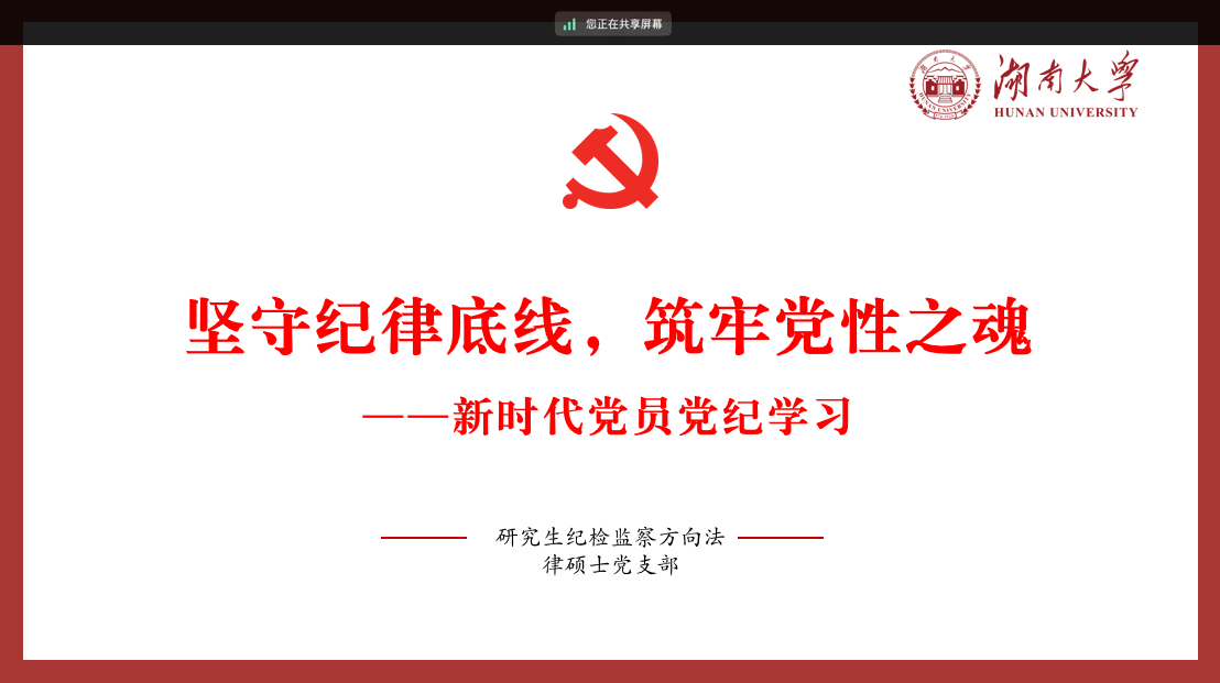 为进一步强化党员干部的党纪意识,提高廉洁自律能力,6月10日,研究生纪检监察方向法律硕士党支部通过线上学习形式,开展了一场以“坚守纪律底线,筑牢党性之魂”为主题的专题党课。本次党课旨在通过深入学习党的纪律规定,引导广大党员干部筑牢拒腐防变的思想道德防线,确保党的先进性和纯洁性。