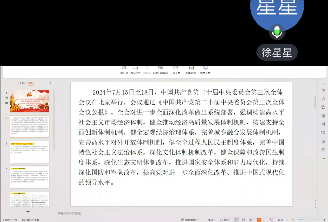 最后,党支部书记对本次学习活动进行了总结。她强调,本次主题党日活动不仅是一次深刻的思想洗礼,也是一次凝聚共识、振奋精神、激发干劲的重要契机,进一步增强了支部与党员之间、党员与党员之间的团结与交流。全体党员将以此为契机,继续深化学习党的二十届三中全会精神,为推动全面深化改革贡献智慧和力量。